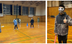 令和8年1月21日(水)、第3回全学年合同HRで、目隠しをしながら音と気配で相手を探る「気配斬り」ゲームを実施しました。 生…